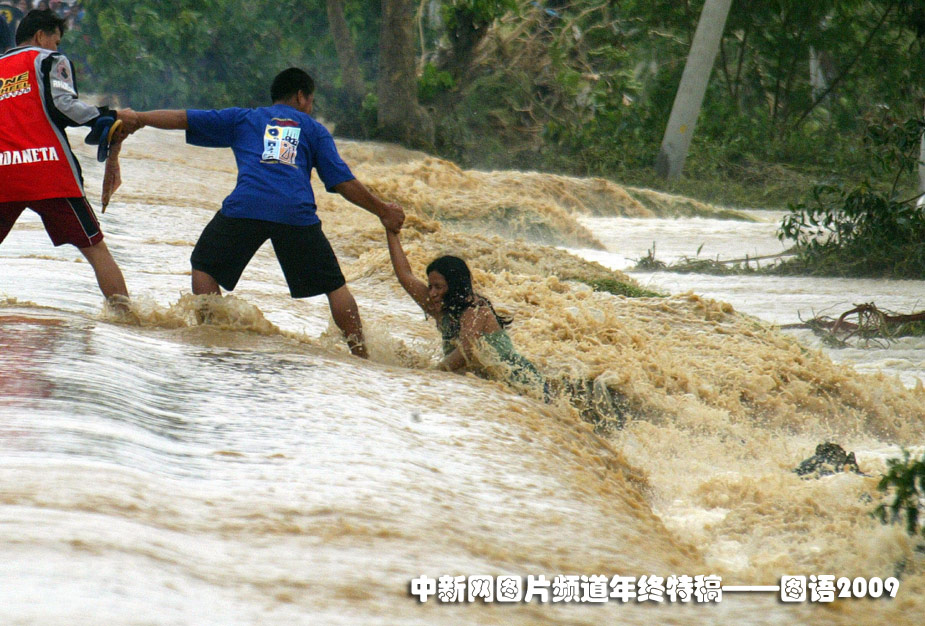 10月9日,在菲律賓北部,幾位民眾正在營救陷入洪水的婦女。