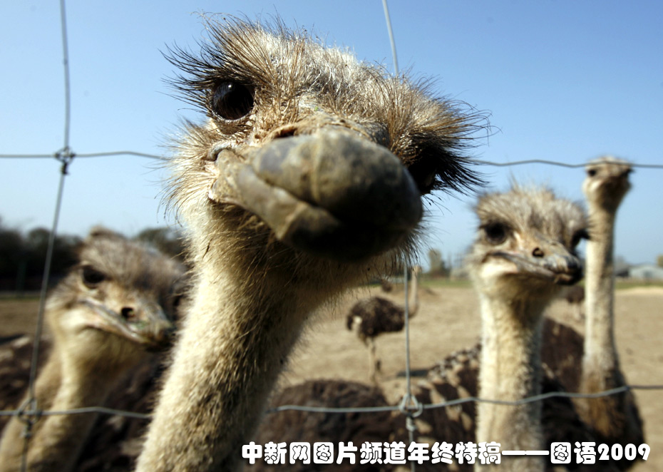 德國(guó)北部的鴕鳥農(nóng)場(chǎng)里,一只鴕鳥好奇地看著鏡頭。