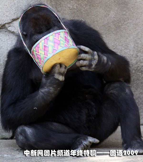 為慶祝復(fù)活節(jié),美國辛辛那提動物園為大猩猩喬莫肯準備了一提籃食物。喬莫肯在吃完全部食物后,還意猶未盡地企圖再翻出一些其它的食物。