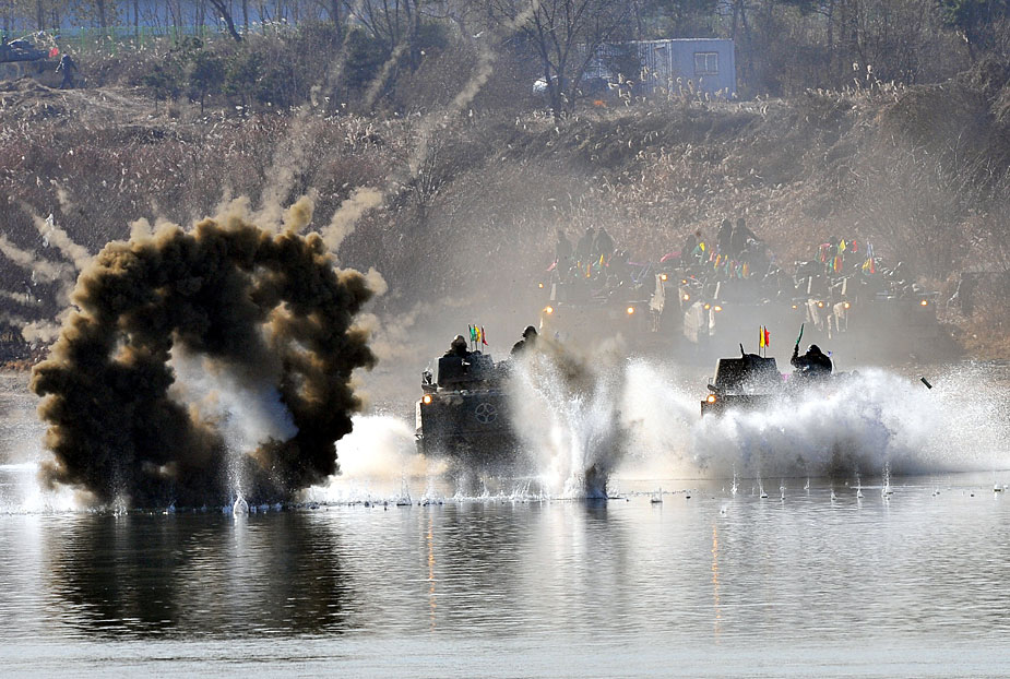 12月16日,韓國第20師團(tuán)機(jī)械化部隊(duì)在京畿道驪州南漢江一帶進(jìn)行大規(guī)模渡河實(shí)戰(zhàn)訓(xùn)練。該訓(xùn)練以培養(yǎng)戰(zhàn)斗執(zhí)行能力為重點(diǎn)。圖片來源:中國新聞網(wǎng)