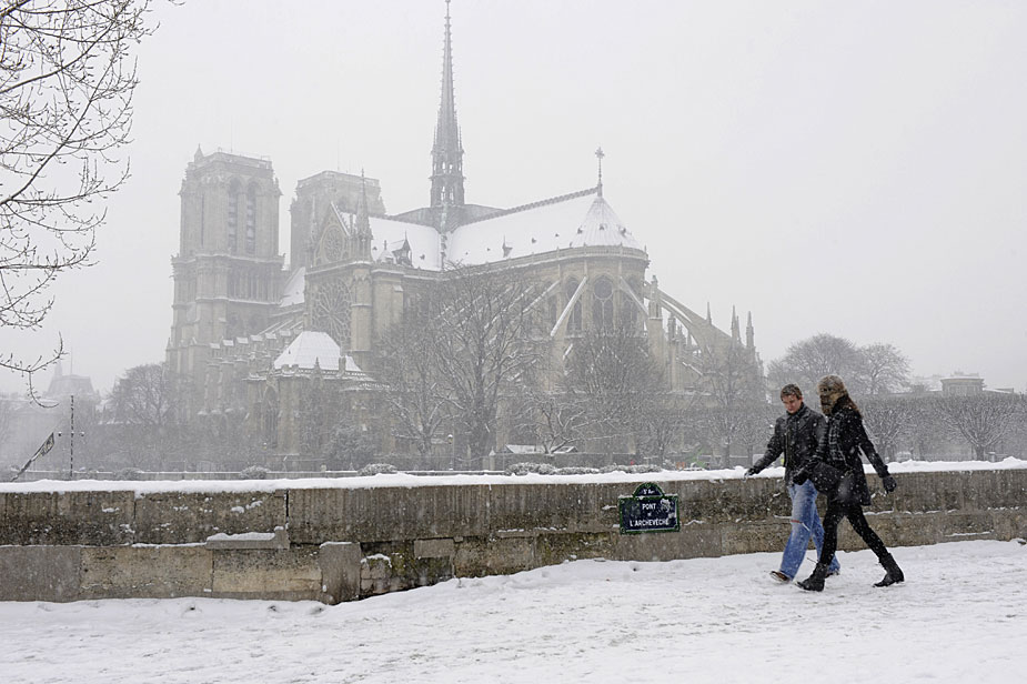 12月17日,法國巴黎圣母院大教堂前的雪中行人。
