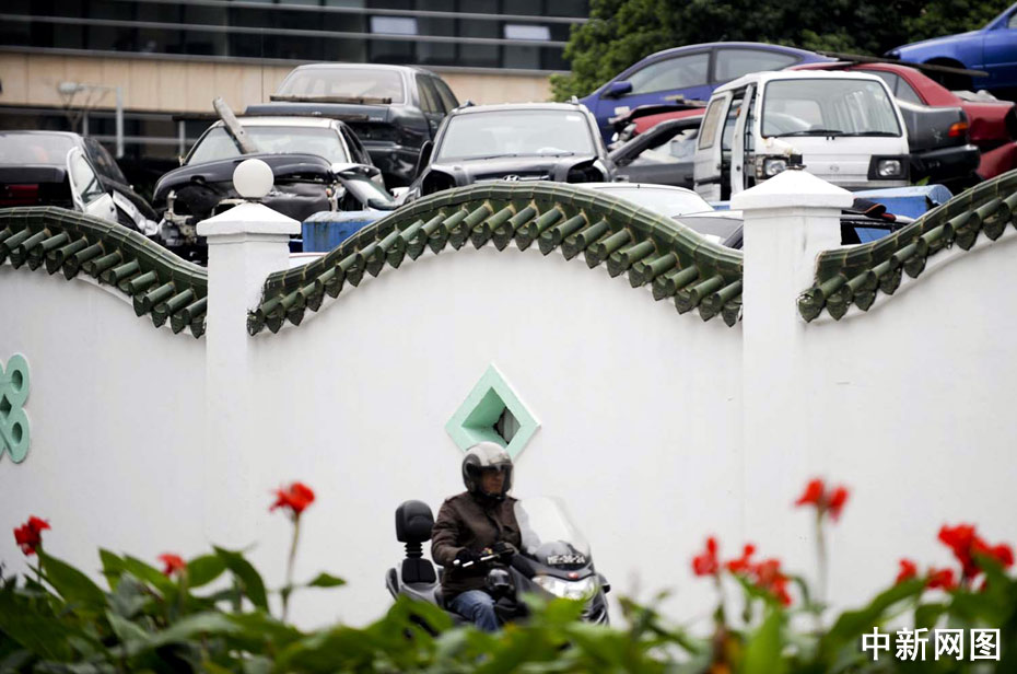 一輛摩托車駛過(guò)澳門一家報(bào)廢汽車回收?qǐng)。中新社記?廖攀 攝