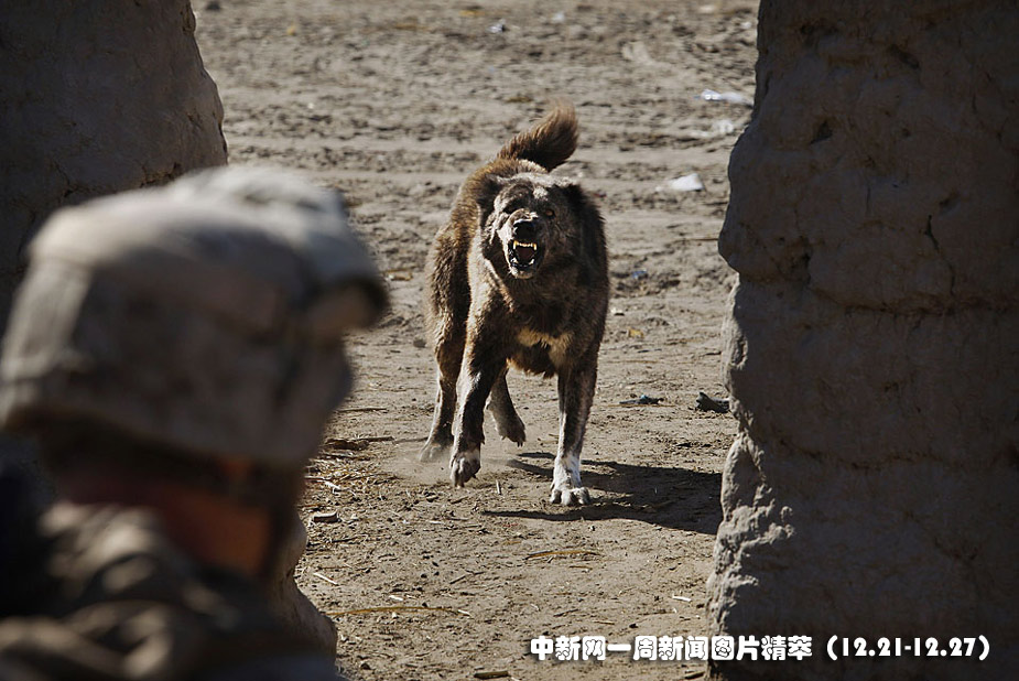 23日(周三),在阿富汗赫爾曼省的加姆賽爾(Garmsir),一條狗向一名美國(guó)海軍士兵狂吠不止。