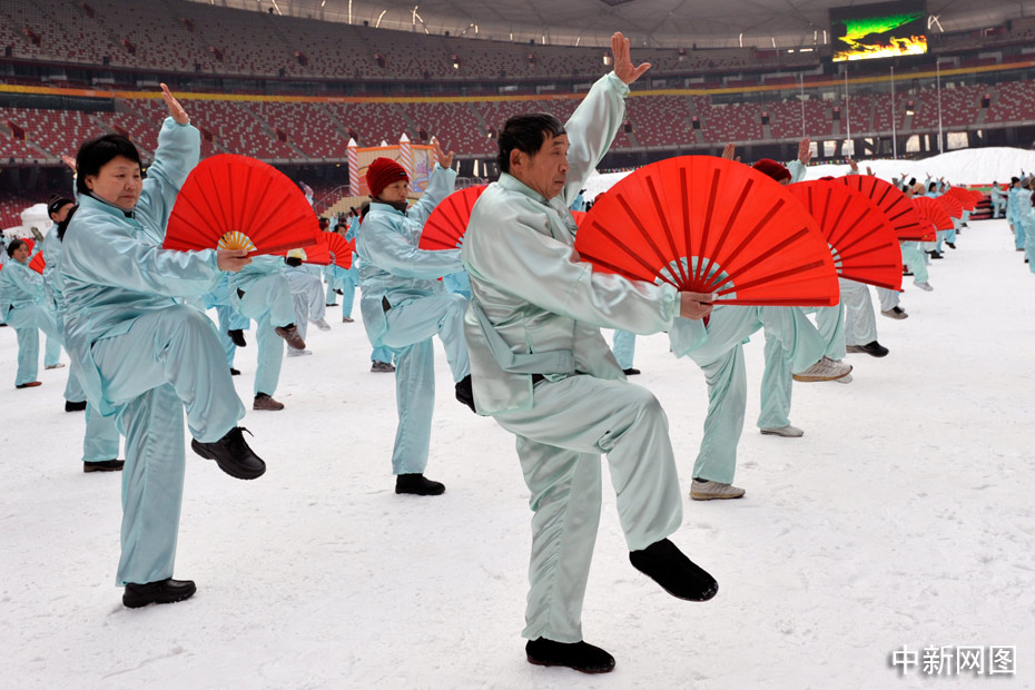 2010年1月1日上午,2010人在被冰雪覆蓋的鳥巢內(nèi)表演了太極拳、武功扇等民族傳統(tǒng)健身項目。中新網(wǎng)記者 金碩 攝
