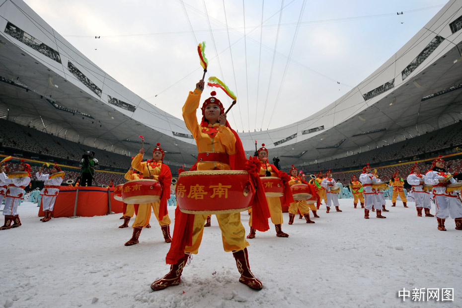 2010年1月1日上午,2010人在被冰雪覆蓋的鳥巢內(nèi)表演了太極拳、武功扇等民族傳統(tǒng)健身項目。中新網(wǎng)記者 金碩 攝