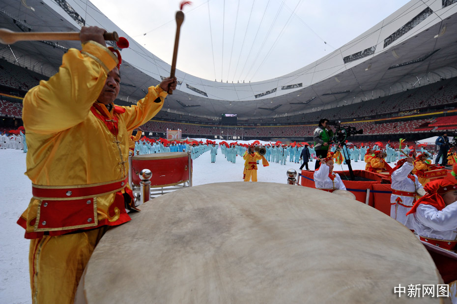 2010年1月1日上午,2010人在被冰雪覆蓋的鳥(niǎo)巢內(nèi)表演了太極拳、武功扇等民族傳統(tǒng)健身項(xiàng)目。中新網(wǎng)記者 金碩 攝