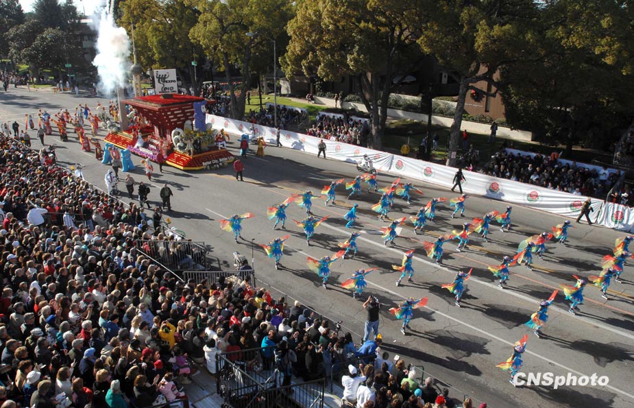 美國(guó)當(dāng)?shù)貢r(shí)間1月1日,第121屆美國(guó)玫瑰花車大游行在加州帕薩迪納市隆重舉行。著名影星成龍助陣中國(guó)上海世博花車。圖片來(lái)源:中國(guó)新聞網(wǎng)