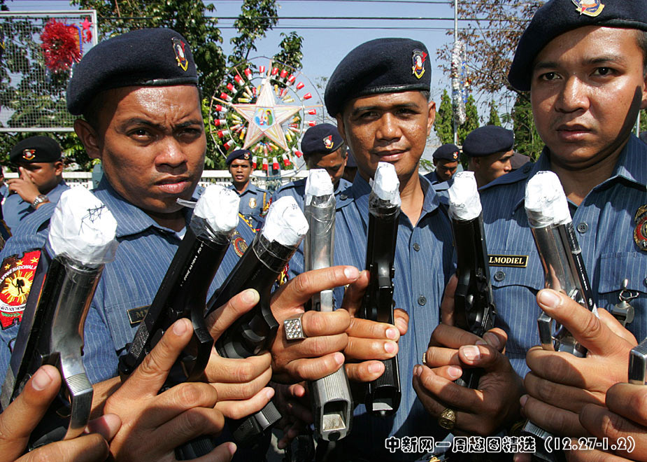 12月29日,菲律賓首都南部的塔吉格市警察部隊(duì)為了防止警務(wù)人員在慶祝新年時(shí)胡亂開槍,下令用膠紙把槍口封起來。圖片來源:中國新聞網(wǎng)>>點(diǎn)擊觀看詳細(xì)內(nèi)容