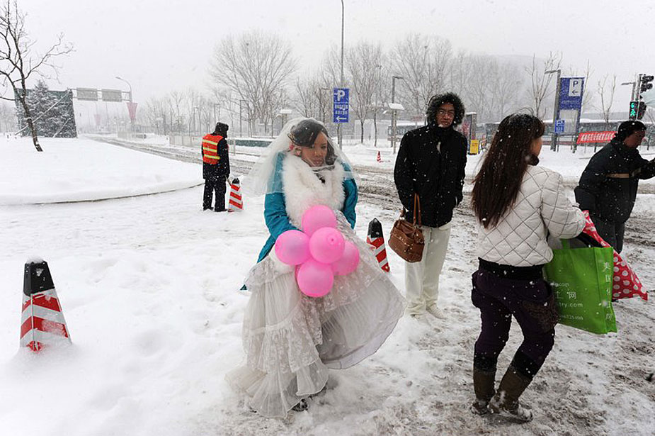 鳥巢邊的馬路,一對新人剛在大雪紛飛中拍完婚紗在路邊等車。周民/CFP