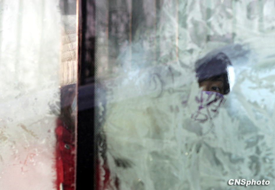 1月4日,大雪之后,北京終于放晴,隨之而來的是大風降溫天氣。北京白天最高氣溫降至零下九攝氏度,成為近50年以來的最冷天。圖為公交車窗上凝結(jié)了厚厚的冰花。中新社發(fā) 劉震 攝。