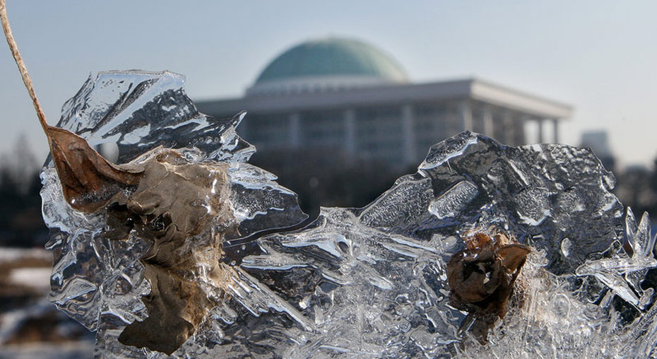 1月3日,首爾,天氣寒冷,隔著冰柱看到的韓國國會大廈。