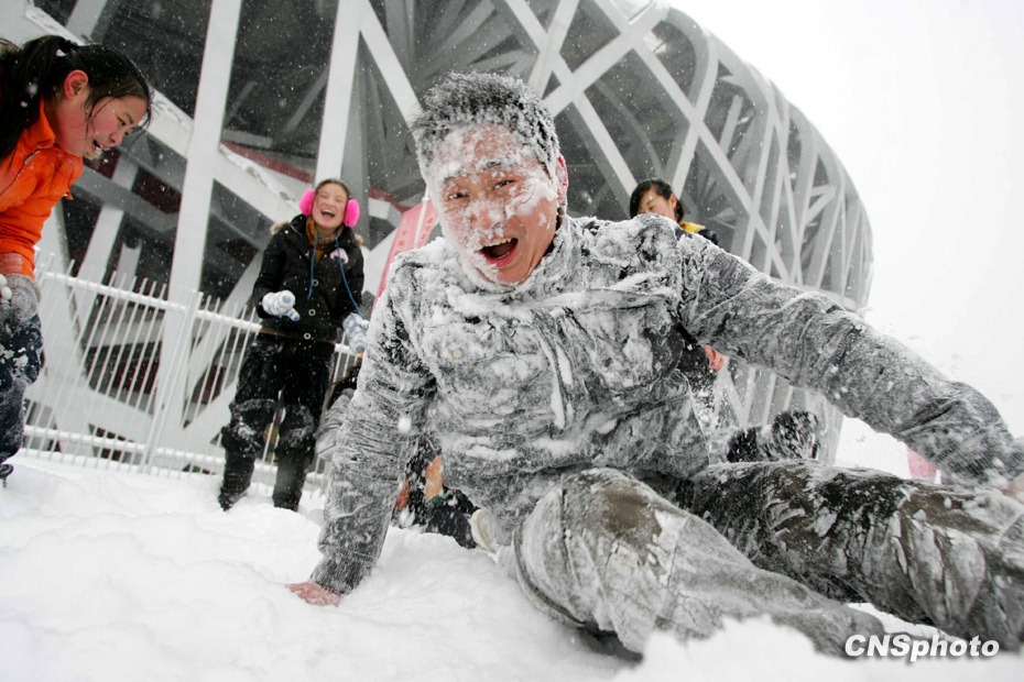 1月3日,北京城降下大雪,北京地區(qū)氣溫逼近40年來的歷史低溫極值。圖為年輕人在鳥巢旁打雪仗。中新社發(fā) 富田 攝