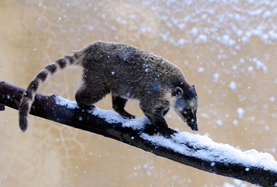 1月6日,倫敦動(dòng)物園的小浣熊在享受難得的雪趣。barcroftmedia/CFP