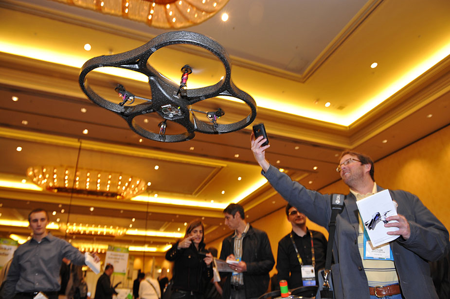 圖為國(guó)際消費(fèi)電子展上展示無(wú)人駕駛直升機(jī)模型。
