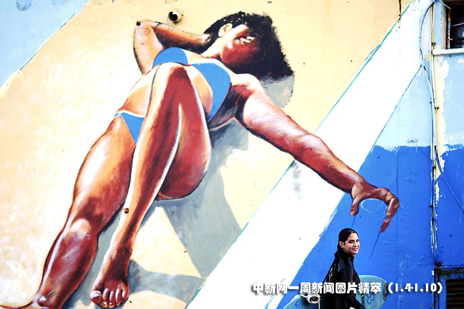 1月4日,(周一)在特拉維夫,一名女孩在地中海沖浪后走過一幅壁畫。當(dāng)日海浪最高達(dá)8英尺。圖片來源:中國(guó)新聞網(wǎng)