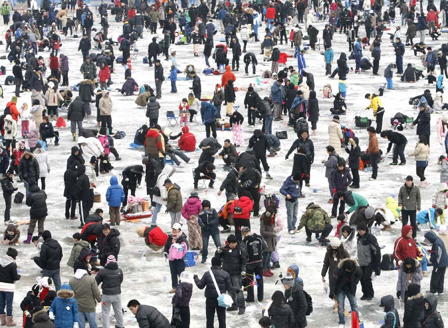 2010年1月9日,韓國(guó)華川郡,一年一度的華川山鱒魚節(jié)當(dāng)日舉行。數(shù)千游客在此“破冰”比賽釣鱘魚。該活動(dòng)每年都會(huì)吸引上百萬(wàn)游客前來(lái)。