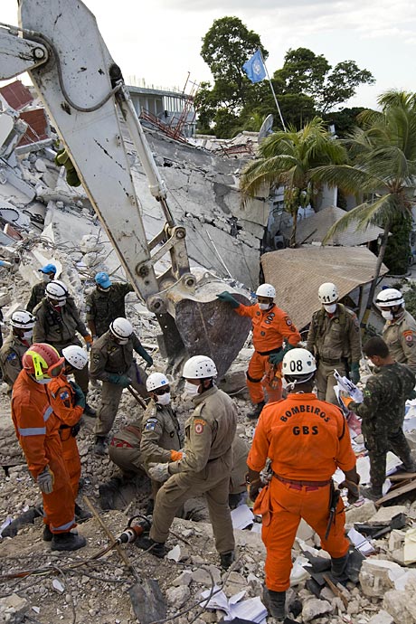 1月16日,海地首都太子港,中國(guó)國(guó)際救援隊(duì)在聯(lián)海團(tuán)總部對(duì)遇難者進(jìn)行搜尋工作。此前八名中方失蹤人員的遺體已全被找到。圖片來(lái)源:中國(guó)新聞網(wǎng)