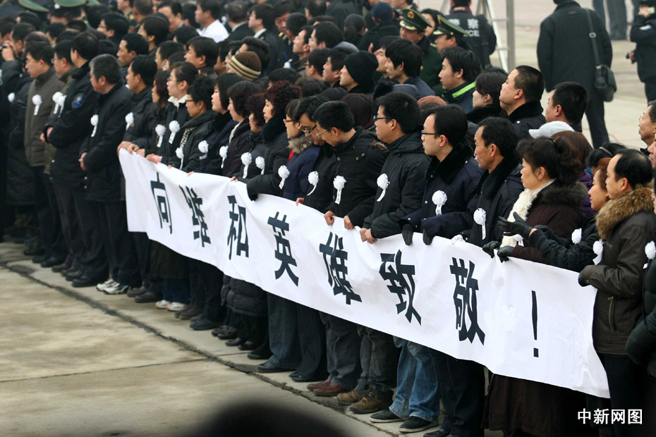 1月19日上午,在海地地震中犧牲的八位中國維和警察遺體回國接機(jī)儀式在北京首都機(jī)場(chǎng)舉行。中新社記者 富田 攝