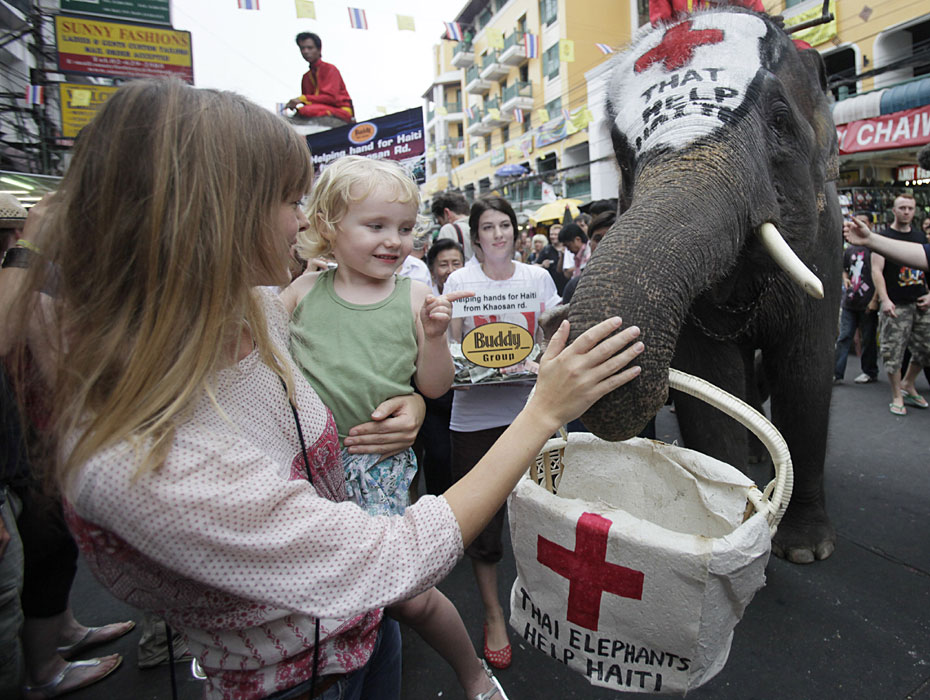 1月21日,在泰國首都曼谷舉辦了一場大象為海地災(zāi)區(qū)募捐活動。人們紛紛向大象攜帶的籃子內(nèi)放入善款,向海地地震幸存者獻上一份愛心。圖片來源:中國新聞網(wǎng)