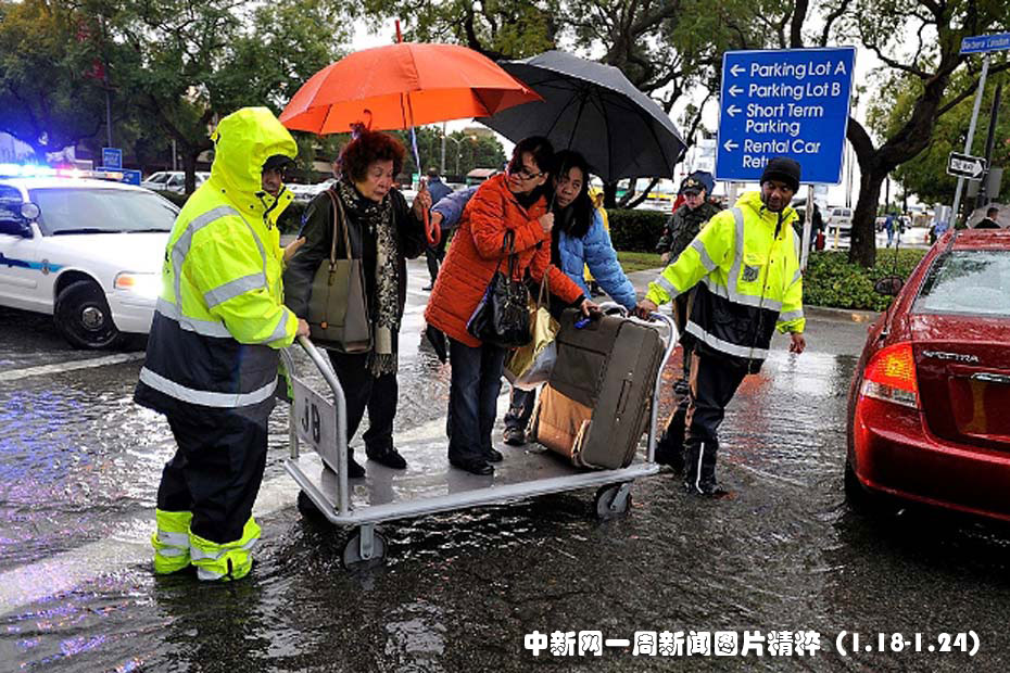 1月20日,在近期遭受暴風(fēng)雨襲擊的加州長灘地區(qū),捷藍(lán)航空公司工作人員幫助乘客穿過被水淹沒的機(jī)場(chǎng)停車場(chǎng)。圖片來源:中國新聞網(wǎng)