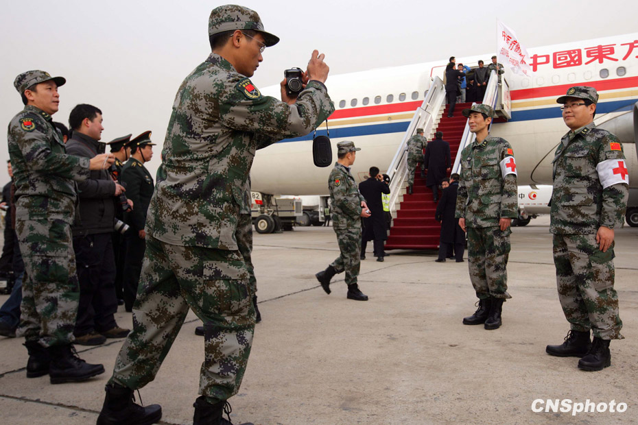 中國人民解放軍醫(yī)護人員和管理人員組成的中國醫(yī)療防疫救護隊一行40人乘坐軍運包機離開北京,啟程前往海地進行人道主義救援任務。中新社發(fā) 劉震 攝