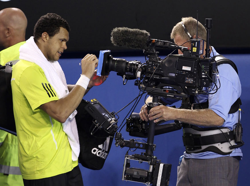 法國球員特松加獲勝后給場邊的攝像機簽名。
