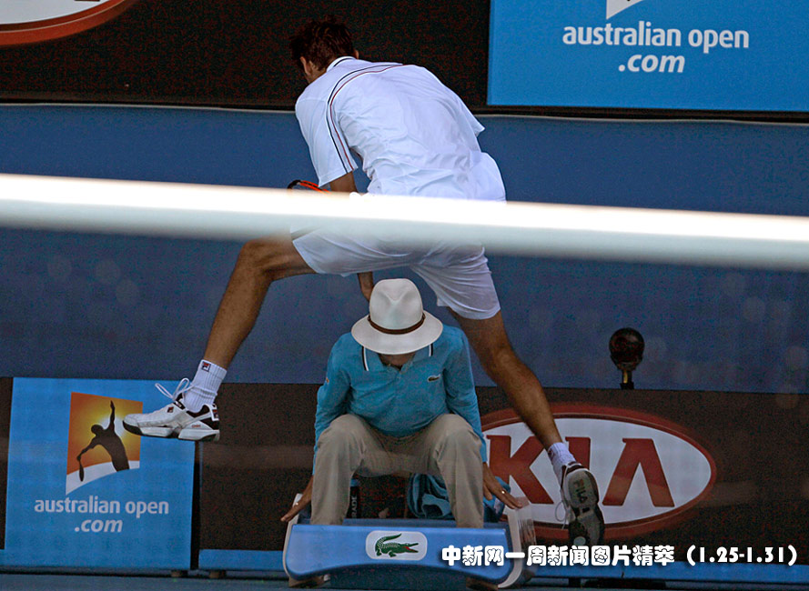 1月26日(周二),在澳網男子四分之一決賽上,克羅地亞選手西里奇(Marin Cilic)在對陣美國選手羅迪克(Andy Roddick)時為救球從邊裁頭頂跳過。圖片來源:中國新聞網