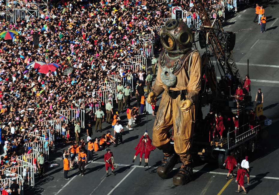 近日,智利首都圣地亞哥街頭,法國(guó)一劇團(tuán)攜巨型提線木偶“小巨人”上街表演,它惟妙惟肖的表情和逼真的神態(tài)引得周圍觀眾的陣陣掌聲。圖片來源:中國(guó)新聞網(wǎng)
