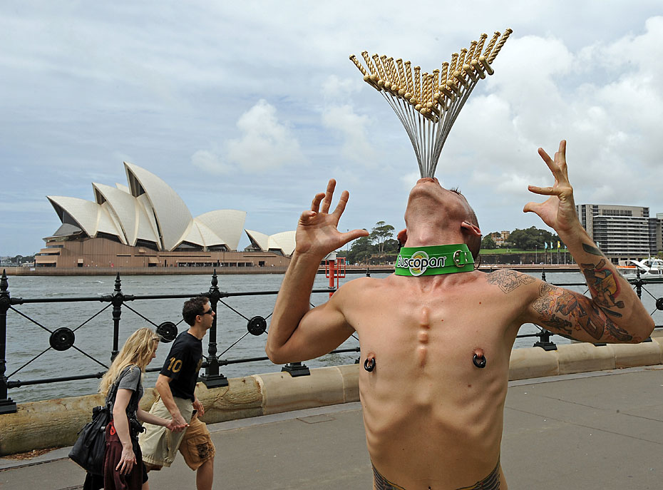 2月8日,街頭藝人Chayne Hultgren在澳大利亞悉尼海港大橋前,一次吞下18把厚約1.3厘米,長(zhǎng)約50.8厘米的長(zhǎng)劍,刷新了吉尼斯世界紀(jì)錄。圖片來源:中國新聞網(wǎng)