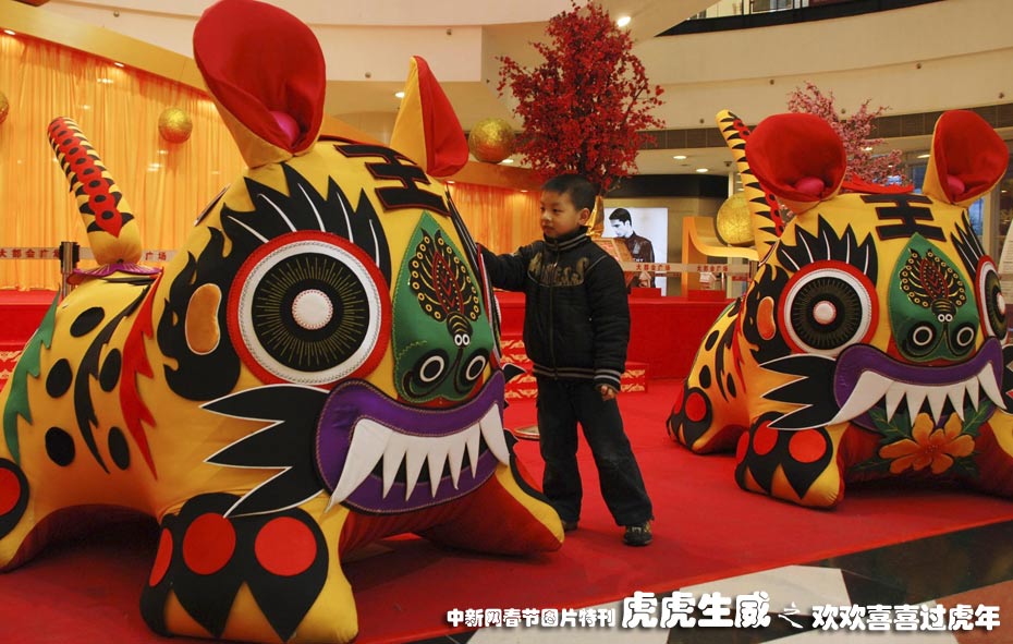 1月下旬,曾榮獲中國民間藝術(shù)高層論壇金獎等多項(xiàng)榮譽(yù)的純手工布藝?yán)匣ⅲ瑏淼街貞c賀新春。在重慶某商場展示的這對布老虎是由奧運(yùn)福娃設(shè)計者韓美林的得意弟子劉清華親自設(shè)計并制作。圖為身長2.2米、寬1.2米、高1.7米的布老虎吸引小朋友駐足拍照留念。中新社發(fā) 郭晉嘉 攝