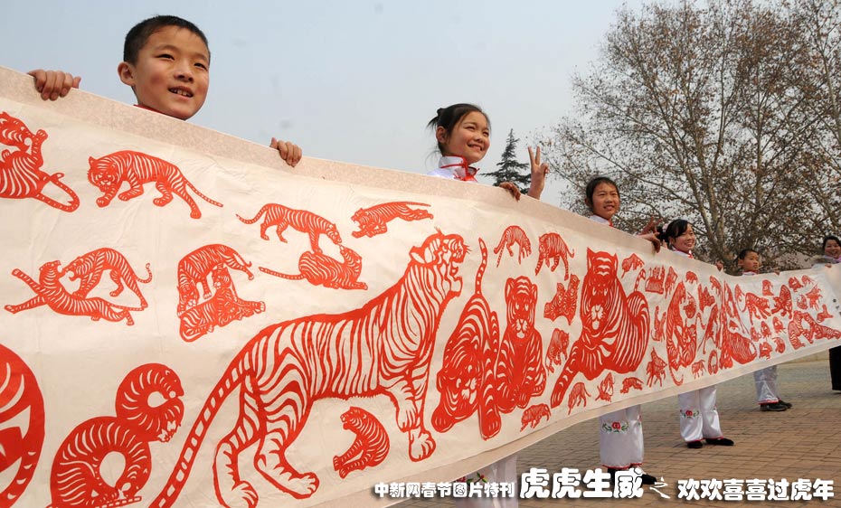 2月4日上午,洛陽市中州西路小學(xué)師生展示10米民間剪紙長卷《百虎爭春》圖。中新社發(fā) 張光輝. 攝