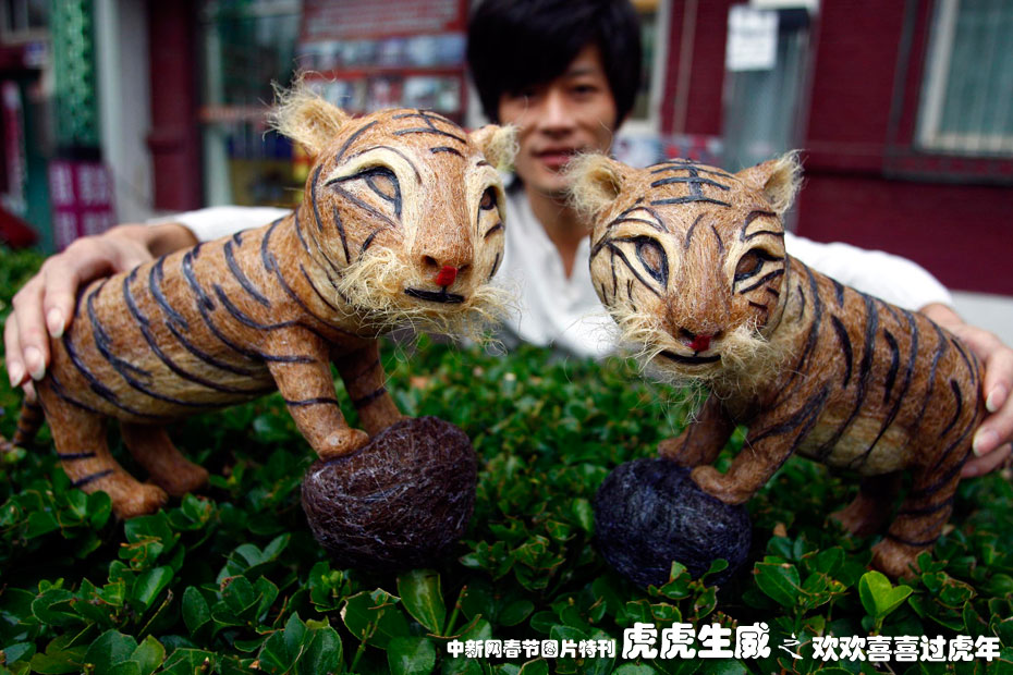 2009年11月9日,北京一位時(shí)尚發(fā)型設(shè)計(jì)師正在展示頭發(fā)絲作品“福虎神威”賀歲虎年。這是祖國60華誕之后的又一新作,四川青年理發(fā)師黃鑫用2.6公斤碎頭發(fā)制作了一對(duì)可愛逼真的“福虎”,歷時(shí)兩個(gè)多月的時(shí)間才完工。中新社發(fā) 鄭雄增 攝