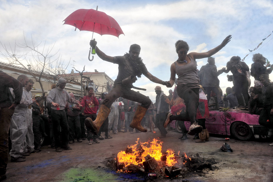2月15日,希臘港口加拉西迪,狂歡者在街頭參加“面粉大戰(zhàn)”!懊娣鄞髴(zhàn)”是當(dāng)?shù)貞c祝狂歡季結(jié)束的一項(xiàng)傳統(tǒng)活動(dòng),隨后將是為期40天的齋戒月直至復(fù)活節(jié)。圖片來(lái)源:中國(guó)新聞網(wǎng)