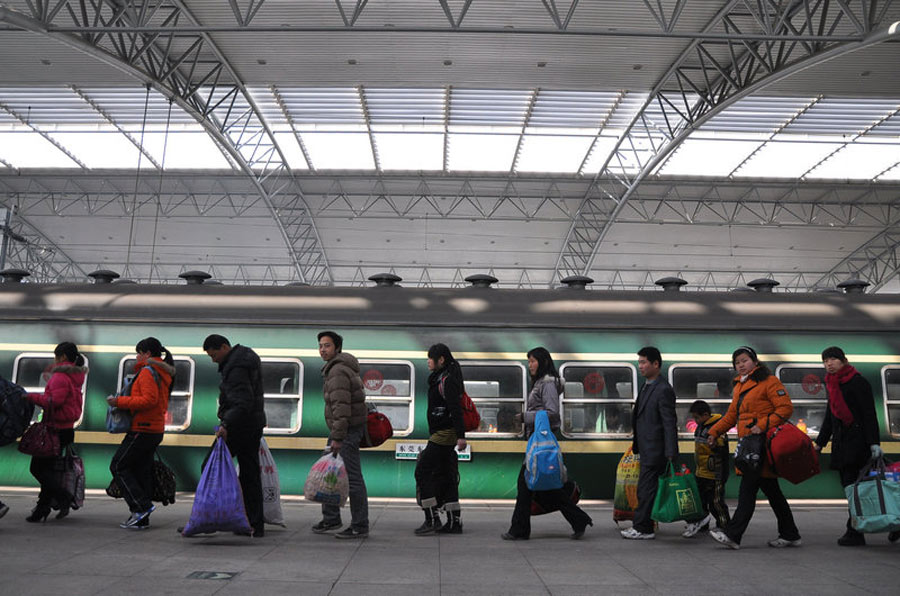 春節(jié)黃金周落幕,節(jié)日的氣氛漸漸淡去,各地春運相繼迎來返程客流高峰。圖為2010年2月19日,旅客在安徽阜陽火車站站臺排隊上車。盧啟建 攝