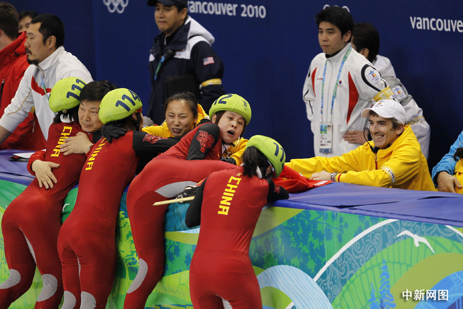 在裁判宣布韓國隊犯規(guī)后,一直等候著最終結(jié)果的中國姑娘忘情地?fù)湎蚪叹毾。圖片清楚地顯示,興奮的王濛撲到教練李琰前面寬寬的防護(hù)墊上,她的右腿無意間高高抬起,冰刀刮到了跟在她身后的張會的下巴。王濛意識到自己闖了禍,馬上關(guān)切地回頭察看張會的傷情。四位姑娘舉著國旗慶祝勝利時,張會用手捂著她的下巴,漸漸地鮮血浸濕了她的手套。
