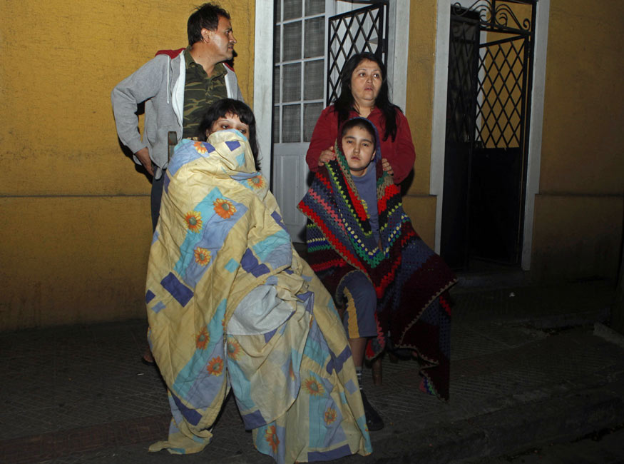 美國(guó)地震勘測(cè)局報(bào)告稱,智利康塞普西翁省附近當(dāng)?shù)貢r(shí)間27日凌晨發(fā)生里氏8.8級(jí)強(qiáng)烈地震,首都圣地亞哥有明顯震感。智利總統(tǒng)巴切萊特已宣布國(guó)家進(jìn)入“災(zāi)難狀態(tài)”。目前強(qiáng)烈地震造成的死亡人數(shù)已經(jīng)升至78人。圖為在智利首都圣地亞哥,正在熟睡中的人們感到地震后紛紛走到戶外。