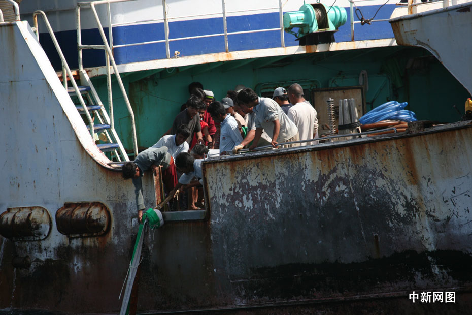 09年4月在西印度洋遭索馬里海盜挾持的臺(tái)灣遠(yuǎn)洋漁船“穩(wěn)發(fā)161號(hào)”,歷經(jīng)各方營(yíng)救,終于在遭挾持10個(gè)多月后,包括船長(zhǎng)顏勝男等共28人返回高雄港。圖片來源:中國(guó)新聞網(wǎng)