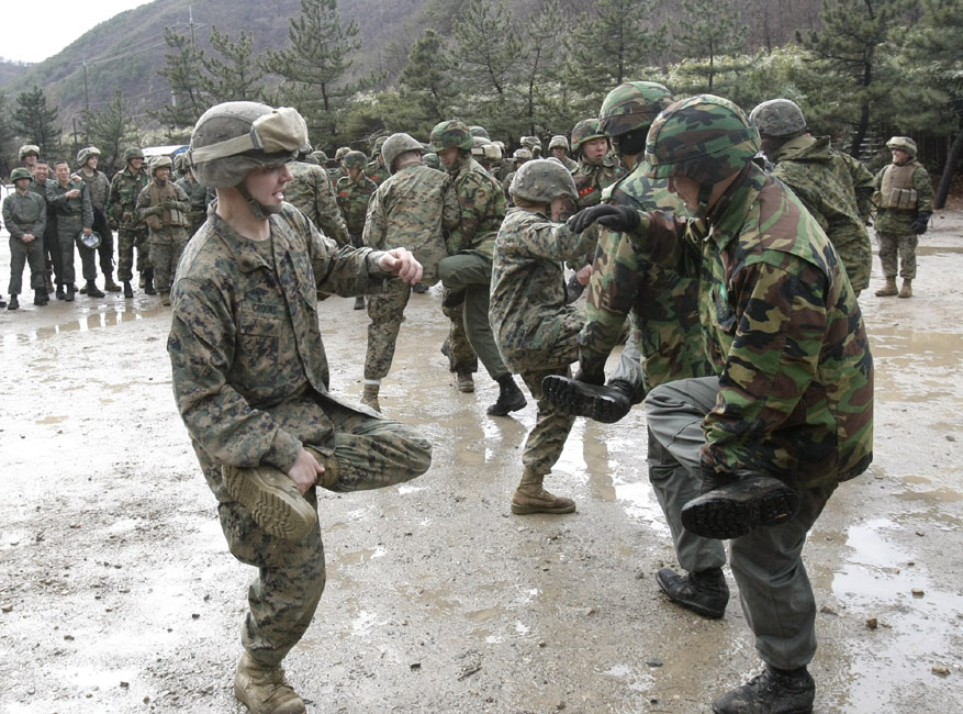 3月11日,在韓國(guó)鎮(zhèn)海海軍基地,韓美兩國(guó)的海軍陸戰(zhàn)隊(duì)舉行了聯(lián)合反恐軍事演習(xí)。