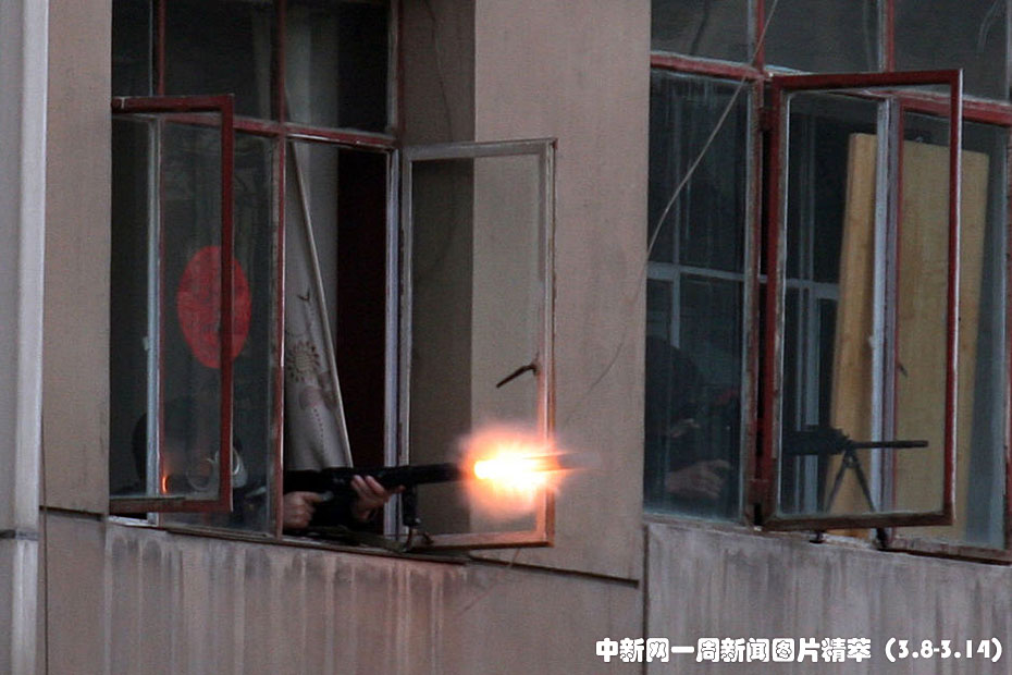 周四,甘肅蘭州,警方向槍殺特警嫌犯的藏匿點(diǎn)開(kāi)火。當(dāng)天,轟動(dòng)全國(guó)的蘭州槍擊案嫌犯付曉霖被警方發(fā)現(xiàn),嫌犯躲進(jìn)一居民樓內(nèi)。雙方對(duì)峙長(zhǎng)達(dá)11個(gè)小時(shí),期間人質(zhì)被解救,最終特警破門(mén)進(jìn)入嫌犯所在屋內(nèi)將其擊斃。圖片來(lái)源:中國(guó)新聞網(wǎng)
