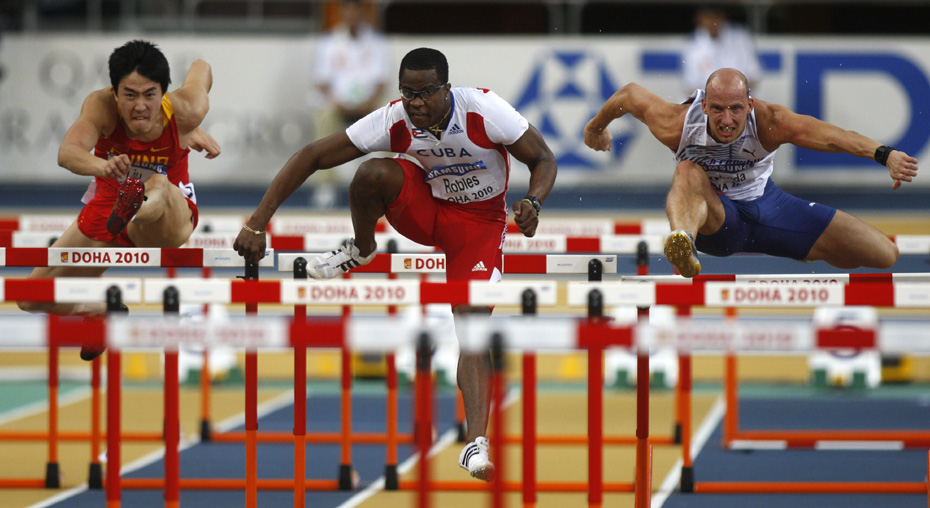 在14日晚間結束的多哈室內田徑世錦賽60米欄決賽中,劉翔僅僅以7秒65的成績獲得第七名。古巴選手羅伯斯則以7秒34成績奪得冠軍并打破室內世錦賽賽會紀錄。圖片來源:中國新聞網
