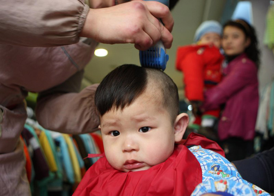 3月17日,寶寶在安徽淮北一家嬰幼兒服務(wù)店內(nèi)“剃龍頭”。王文 攝