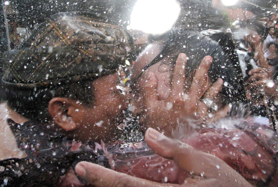 當(dāng)?shù)貢r(shí)間3月17日,印尼旅游勝地巴厘島舉行了傳統(tǒng)的“接吻節(jié)”。圖片來(lái)源:中國(guó)新聞網(wǎng)