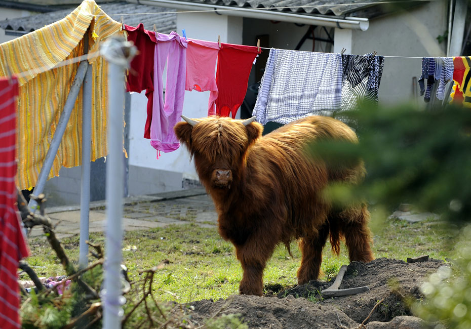3月18日,德國(guó)一頭蘇格蘭高地牛來(lái)到一居民院內(nèi)懶洋洋的曬太陽(yáng),最后經(jīng)過(guò)獸醫(yī)的麻醉和消防員協(xié)力才將這頭蠻力十足的家伙“制服”。圖片來(lái)源:中國(guó)新聞網(wǎng)