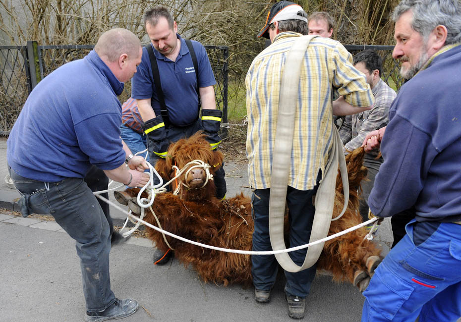 3月18日,德國(guó)一頭蘇格蘭高地牛來(lái)到一居民院內(nèi)懶洋洋的曬太陽(yáng),最后經(jīng)過獸醫(yī)的麻醉和消防員協(xié)力才將這頭蠻力十足的家伙“制服”。圖片來(lái)源:中國(guó)新聞網(wǎng)