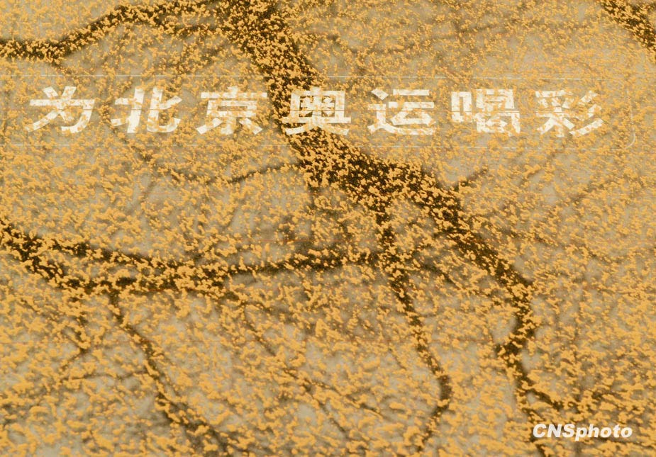 3月20日,春季首場重度浮塵天遮蓋了整個北京城。圖為一輛轎車的后車窗上布滿黃沙。中新社發(fā) 廖攀 攝