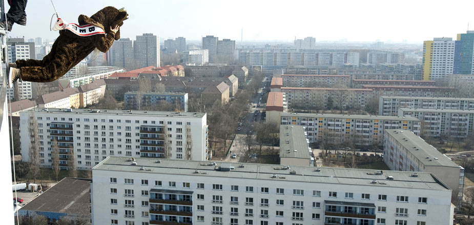 3月18日,在德國柏林舉行的“高樓漫步”活動中,一名女子打扮成熊的模樣(柏林的象征)在天使酒店外墻上行走,參加活動的人都有繩索保護。