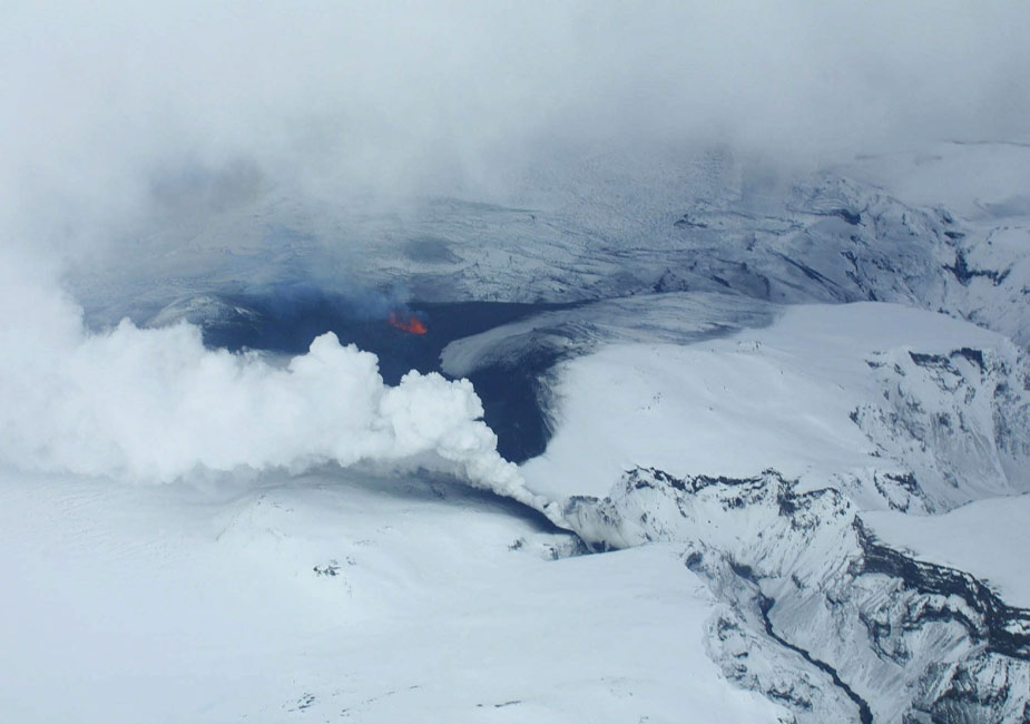 3月21日,冰島首都雷克雅未克東南方向的埃亞菲亞德拉冰蓋冰川,熔巖從火山口噴出。 這座火山于20日午夜前后就開始噴發(fā)。圖片來源:中國(guó)新聞網(wǎng)