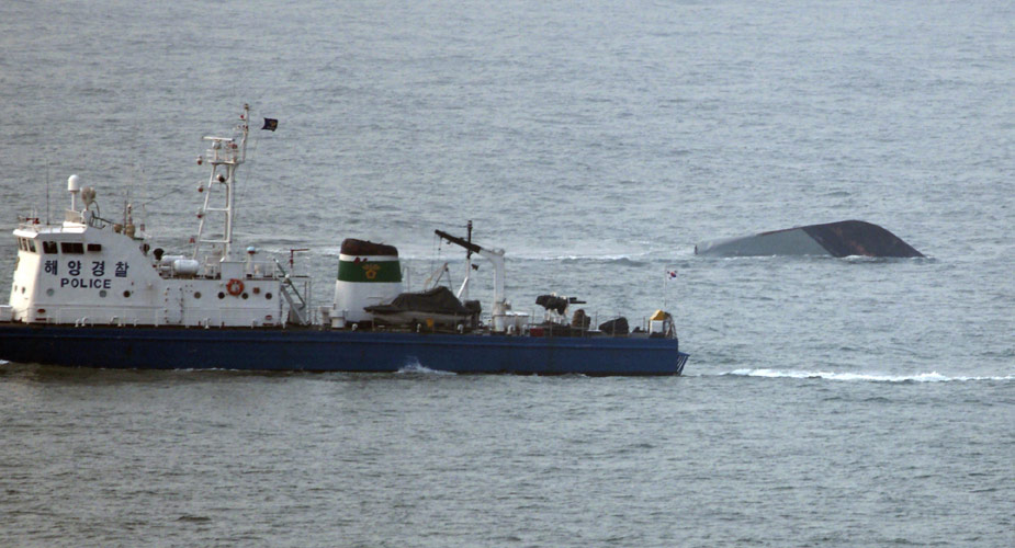 首爾當地時間26日晚9點45分許,在韓國西部海域執(zhí)行警戒任務的天安艦(1200噸級)因不明原因事故,船底被炸開洞,船尾開始下沉。天安艦上共有104人,韓國巡邏艇和直升飛機迅速展開救援行動,事發(fā)5小時后,官員稱已救出58人,但因為強風和夜幕,救援行動進展緩慢,其它人員仍下落不明。圖為一艘救援船靠近幾近沉沒的韓國海軍“天安艦”。