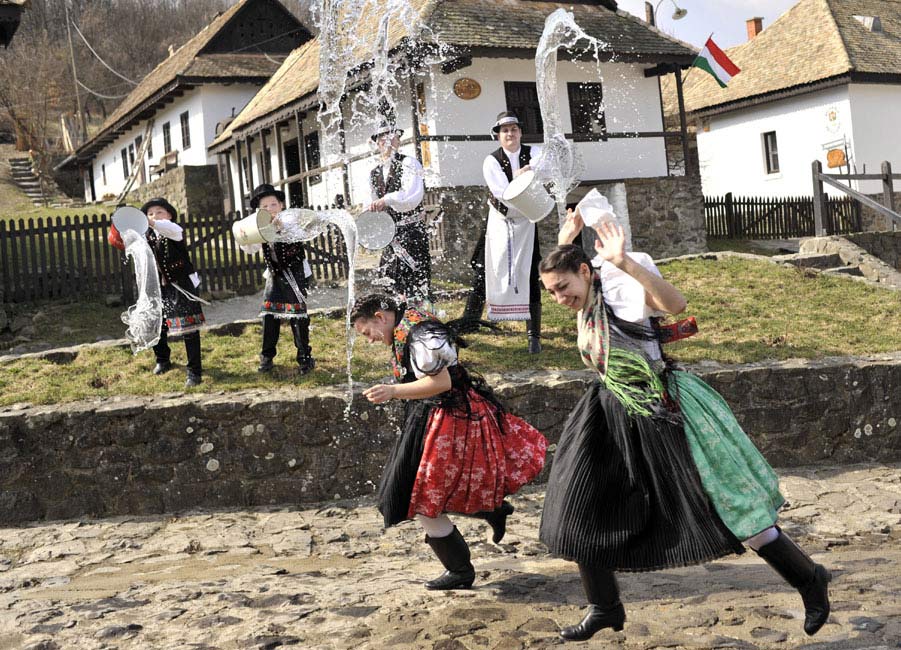 3月26日,在匈牙利首都布達(dá)佩斯以東被譽(yù)為世界文化遺產(chǎn)的霍洛克村,當(dāng)?shù)鼐用褚韵蚬媚锷砩蠞娝膫鹘y(tǒng)儀式慶祝復(fù)活節(jié)。此項(xiàng)古老習(xí)俗起源于公元2世紀(jì)。