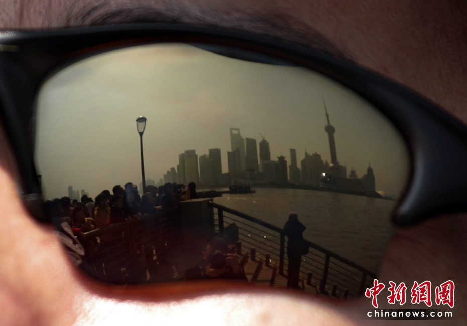 一個戴太陽眼鏡的外國游客,參觀上海外灘。